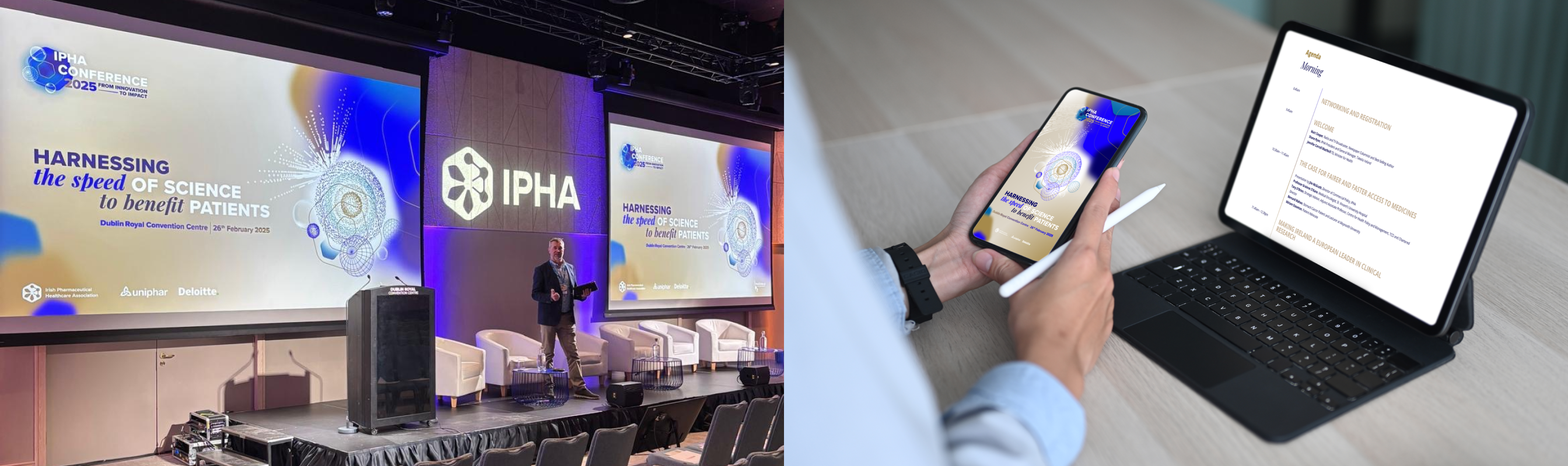 The Irish Pharmaceutical Healthcare Association commissioned Agency X to create and produce their 2025 Annual Conference. Titled ‘Harnessing the Speed of Science to Benefit Patients’, our team managed all aspects of this high profile event from creating it’s visual identity, to full stage management and technical production on the day itself. We also produced a highlight video on the same day.